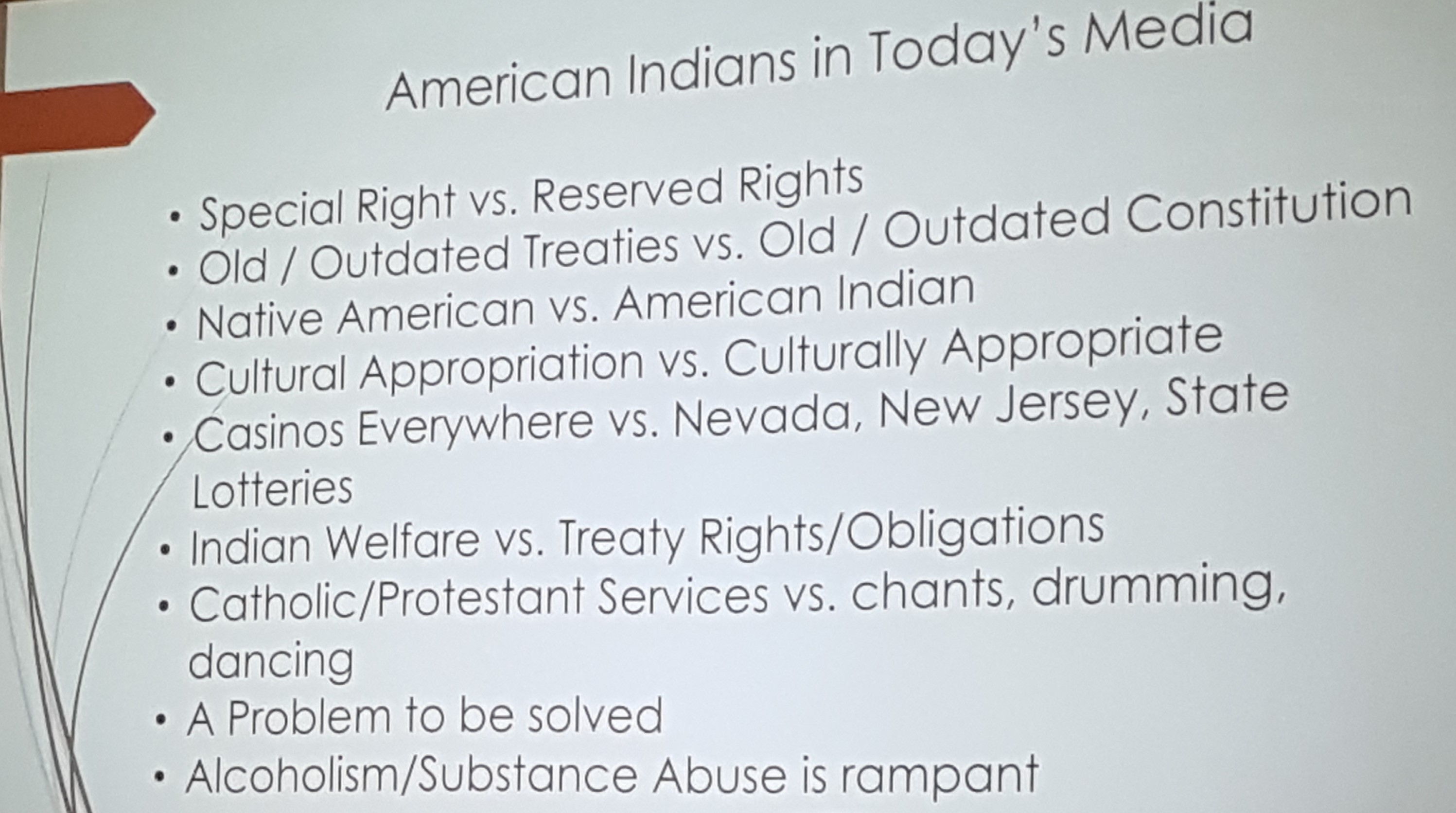 Another slide had four romance book covers with Savage in the book titles and a male Indian embracing a White woman. Dr. Cash Cash said that not only was there stereotyping but a trope being used as well. Tropes were another way the American Indian has been “put down” over the years. Portrayals of drunken Indians, calling them Nomads when they are hunter gatherers and travel with the seasons.