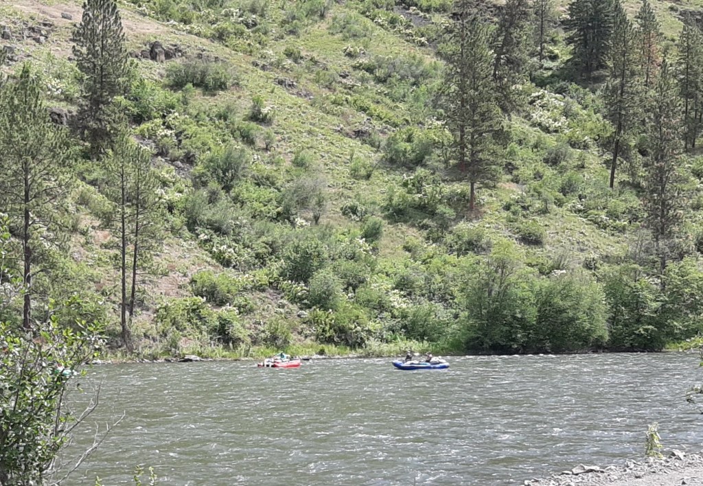 After taking photos of the campground where the murder will take place, I headed back on another route that followed the Grand Ronde River for several miles. I took a photo of a group rafting. The colorful rafts caught my eye.