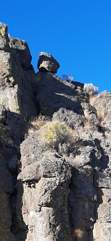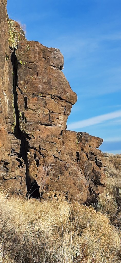 We have one rock that looks like a head. At a book event in Portland, I noticed a book with a cover depicting a rock like we have on our property. I started up a conversation with Wilson Wewa, a Paiute man, whose story of traveling around with his grandmother and Northern Paiute legends were in the book. The Northern Paiute traveled around the Great Basin, which is part of where I live now. This rocks that look like heads are guarding sacred places.