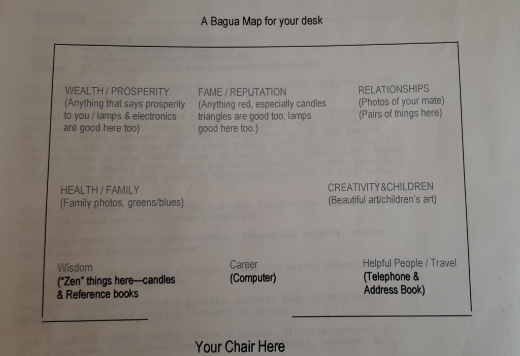 Through Feng Shui you arrange things based on the principles of Bagua. Ba means eight and gua means area. So you place items with different energy or focus in each of the areas. The areas are: Prosperity, Fame & Reputation, Relationships, Health & Family, Foundation, Creativity, Wisdom, Career, and Helpful People. This workshop showed me that you can make things happen by how you set your life and your workspace up.