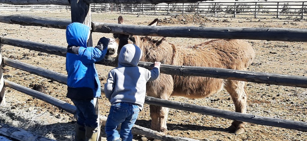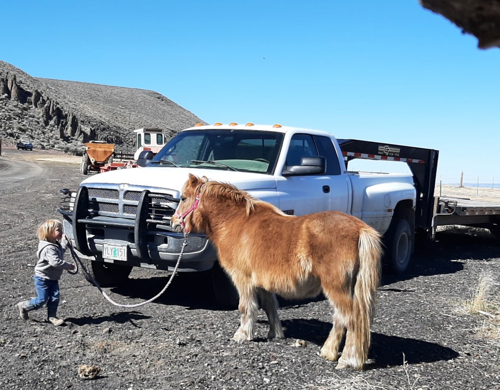 My daughter, who lives down the road, brought over two horses and two ponies to get their feet trimmed. She also brought one of her older boys and the two littlest grandkids. The littlest grandchild, tried to help her mom load up, her pony, Candy.