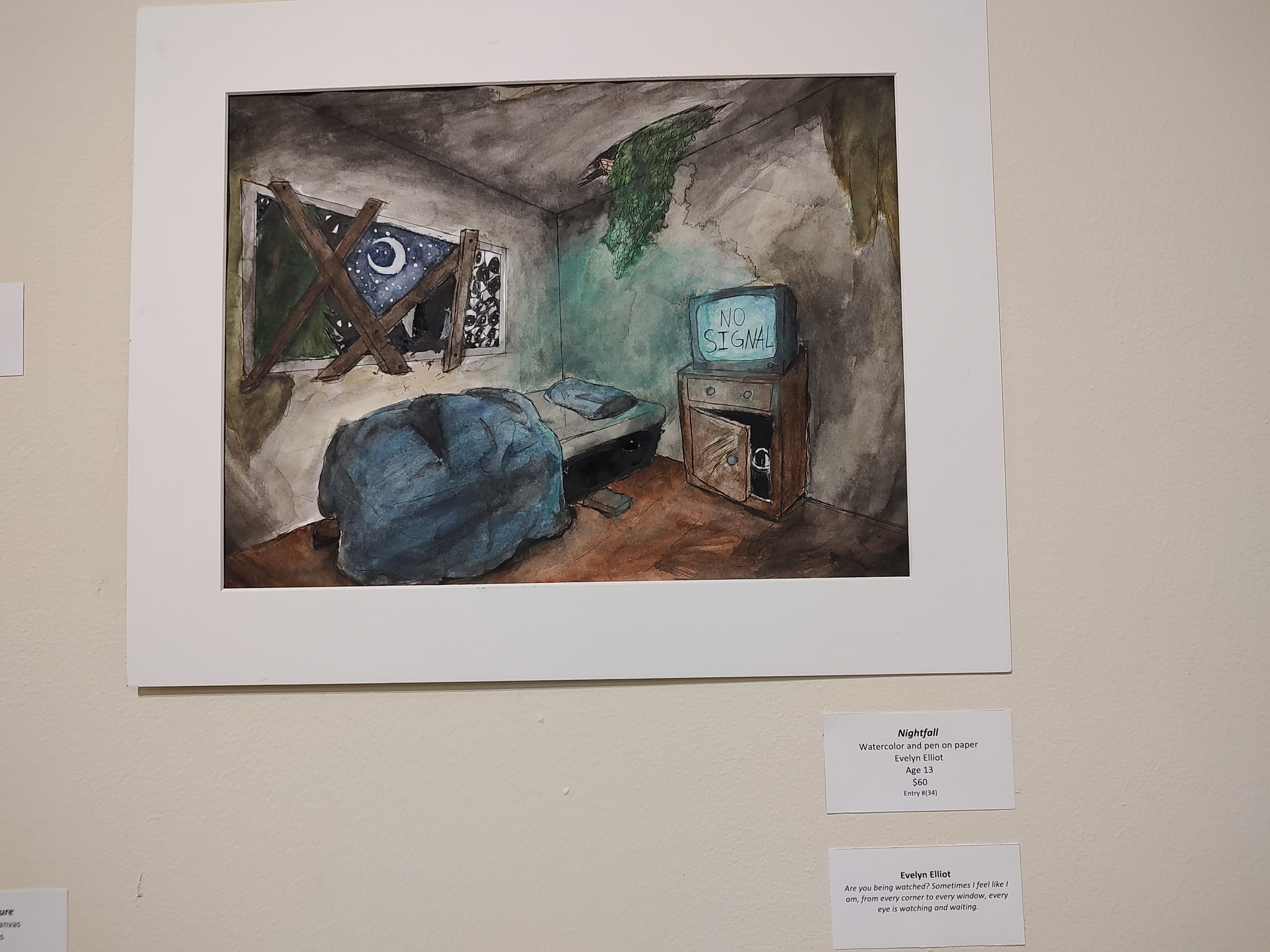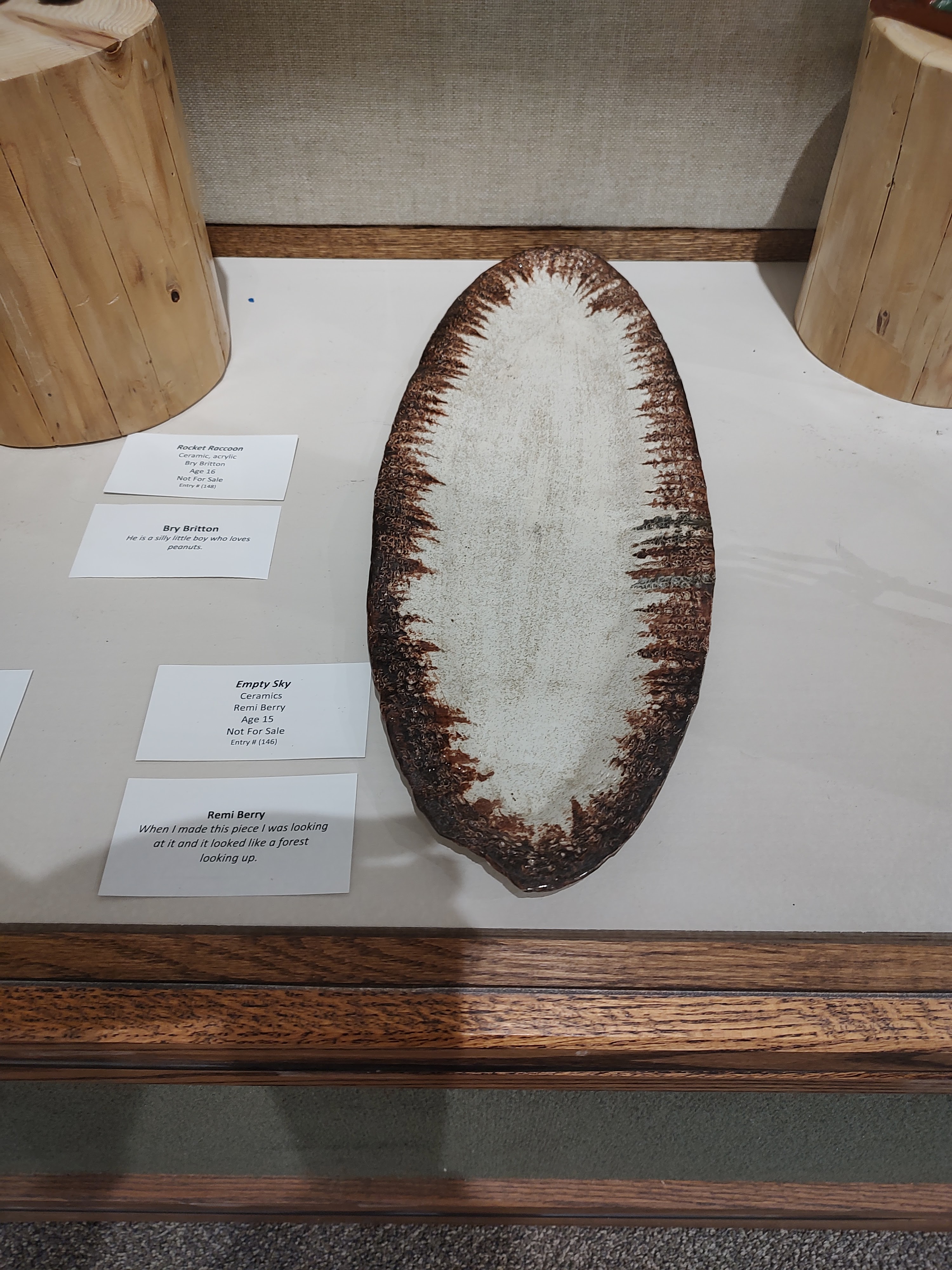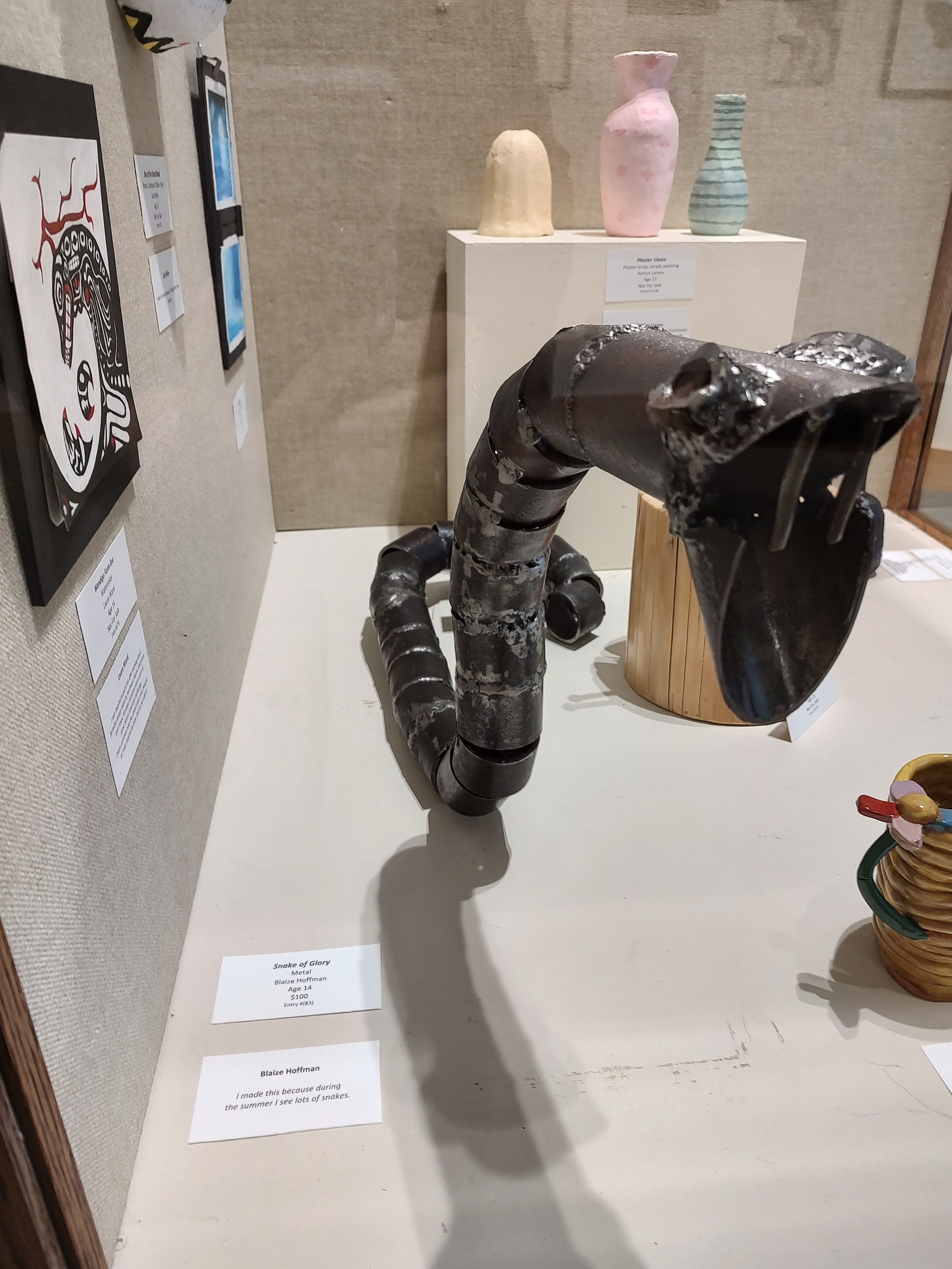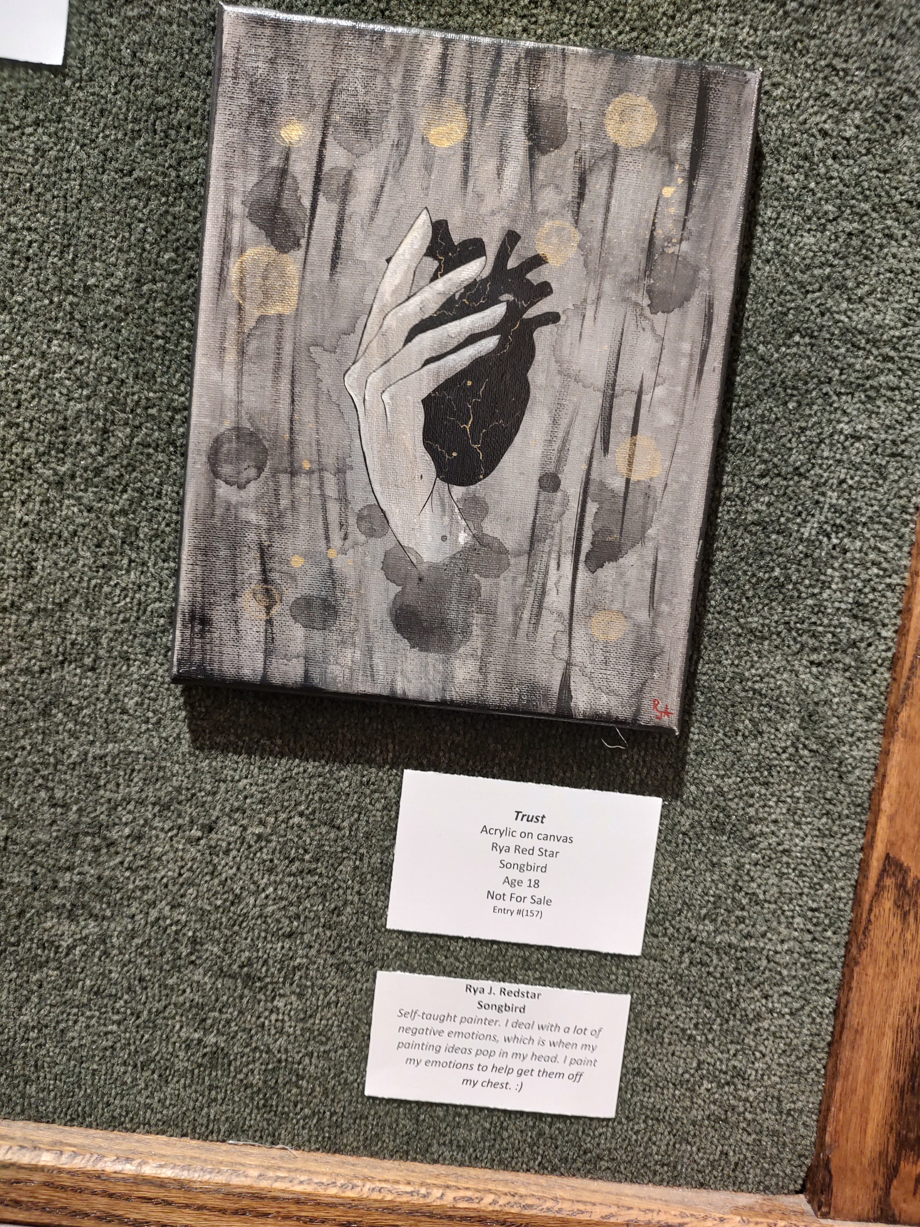 But it was the exhibit they had going now through March 18th that I spent the most time looking at. It is the 2023 ArtWORKZ Junior Art Show & Competition. There were paintings, drawings, pottery, beading, metal work, and other mediums of art. I took photos of the pieces that made me feel something.