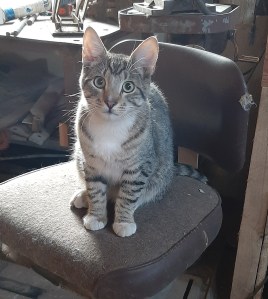 We have four cats who stay in my hubby’s shop. I check on them and feed them every morning and evening. Cautious- seen below, is so named because he usually is cautious about people. Lately he’s been coming down off his high perch and greeting me when I feed.